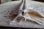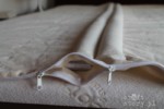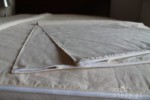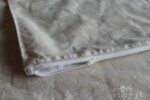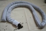 Pokrowiec z surówki 100% bawełnianej, przeszyty tak, żeby utworzyły się tunele. Do każdego tunelu wsuwany rękaw z bawełnianego batystu. Każdy taki rękaw wypełniony łuską gryki. (na zdjęciu widać zaledwie dwa (z 28) wypełnione tunele)